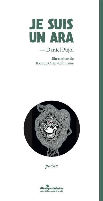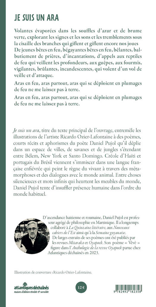 Je suis un ara, titre du texte principal de l’ouvrage, entremêle les illustrations de l’artiste Ricardo Ozier-Lafontaine à des poèmes, courts récits et aphorismes du poète Daniel Pujol qu’il déplie dans un espace de villes, de savanes et de jungles s’étendant entre Bélem, New York et Santo Domingo. Créole d’Haïti et portugais du Brésil viennent s’immiscer dans une langue française enfiévrée qui peint le règne du vivant à travers des métamorphoses et des dialogues avec le monde animal. Entre choses silencieuces et mots infinis qui heurtent les meubles du monde, Daniel Pujol tente d’insuffler présence humaine dans l’ordre du monde habituel, implorant les aras qui se déploient en plumages de feu de ne pas le laisser à terre.Je suis un ara est présélectionné pour le concours international de création poétique Balisaille 2024.