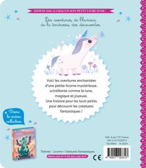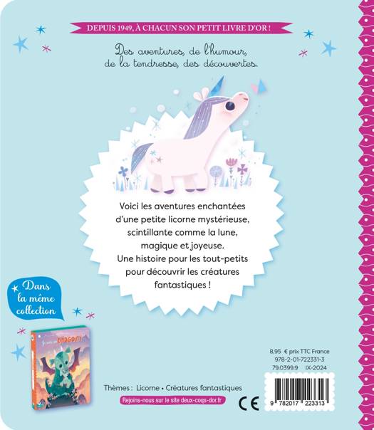 Un tout-carton de 26 pages avec un jaspage de couleur sur la tranche, bien adapté aux petites mains. Une histoire toute simple qui met en scène une petite licorne qui s'adresse directement aux enfants et leur raconte ses aventures enchantées. Une première initiation aux créatures fantastiques.