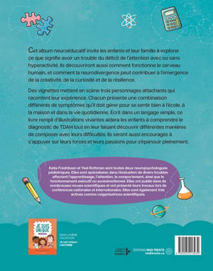 Cet album neuroéducatif propose aux enfants et à leurs familles de découvrir ce que signifie avoir un trouble du déficit de l’attention avec hyperactivité, comment fonctionne le cerveau humain, et comment la neurodivergence peut contribuer à l’émergence de la créativité, de la curiosité et de la résilience. Des vignettes mettent en scène trois personnages attachants qui racontent leur expérience. Chacun présente une combinaison différente de symptômes qu’il doit gérer pour s’épanouir à l’école, à la maison et dans la vie quotidienne. À l’aide d’un langage simple et d’illustrations vivantes, ce livre aide les enfants à comprendre le diagnostic de TDAH tout en découvrant différentes manières de faire face aux défis comportementaux. Ils y seront aussi encouragés à trouver leurs forces et leurs passions pour s’épanouir pleinement.