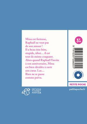 Mina est furieuse, Raphaël ne veut pas de son amour ! Il a beau être bête, stupide, idiot... il est tout de même craquant. Alors quand Raphaël l'invite à son anniversaire, Mina est bien décidée à ravir son coeur. Las... Rien ne se passe comme prévu.