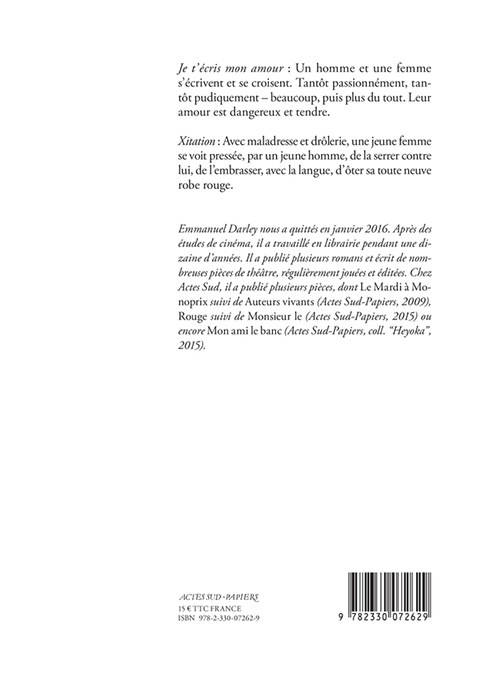 «Emmanuel Darley nous a quittés en janvier 2016 Après des études de cinéma, il a travaillé en librairie pendant une dizaine d'années. Il a publié plusieurs romans et écrit de nombreuses pièces de théâtre, régulièrement jouées et éditées. Chez Actes Sud, il a publié plusieurs pièces, dont »Le Mardi à Monoprix« suivi de »Auteurs vivants« (Actes Sud-Papiers, 2009), »Rouge« suivi de »Monsieur le« (Actes Sud-Papiers, 2015) ou encore »Mon ami le banc« (Actes Sud-Papiers, coll. "Heyoka", 2015).»
