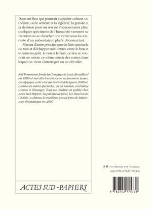 «Joël Pommerat fonde la Compagnie Louis Brouillard en 1990 et met dès lors en scène ses premers textes. Ce diptyque a été créé au Festival d'Avignon 2008 et, comme ses autres spectacles, est en tournée, en France comme à l'étranger. Tout son théâtre est publié chez Actes Sud-Papiers. Sa précédente pièce, »Les Marchands« (2006), a obtenu le troisième grand prix de Littérature dramatique en 2007.»