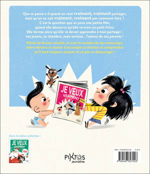 Que se passe-t-il quand on veut vraiment, vraiment partager, mais qu’on ne sait vraiment, vraiment pas comment faire ? C’est la question que se pose une petite fille, quand elle découvre qu’elle va avoir un petit frère. Elle devine alors qu’elle va devoir apprendre à tout partager : ses jouets, sa chambre, mais surtout… l’amour de ses parents ! Pleine de bonne volonté, et avec le soutien de son entourage, notre héroïne va réussir à accomplir sa mission et comprendre qu’il faut toujours essayer et ne pas se décourager !