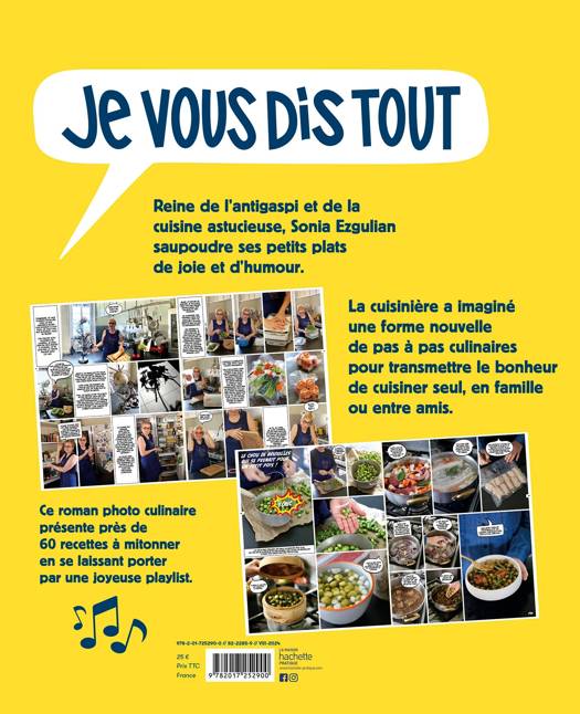 Reine de l'antigaspi et de la cuisine astucieuse, Sonia Ezgulian saupoudre ses petits plats de joie et d'humour. La cuisinière a imaginé une forme nouvelle de pas à pas culinaires pour transmettre le bonheur de cuisiner seul, en famille ou entre amis. Ce roman photo culinaire présente près de 60 recettes à mitonner en se laissant porter par une joyeuse playlist.