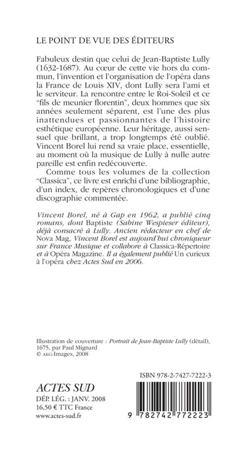 Fabuleux destin que celui de Jean-Baptiste Lully (1632-1687). Au coeur de cette vie hors du commun, l'invention et l'organisation de l'opéra dans la France de Louis XIV, dont Lully sera l'ami et le serviteur. La rencontre entre le Roi-Soleil et ce "fils de meunier florentin", deux hommes que six années seulement séparent, est l'une des plus inattendues et passionnantes de l'histoire esthétique européenne. Leur héritage, aussi sensuel que brillant, a trop longtemps été oublié. Vincent Borel lui rend sa vraie place, essentielle, au moment où la musique de Lully à nulle autre pareille est enfin redécouverte. Comme tous les volumes de la collection "Classica", ce livre est enrichi d'une bibliographie, d'un index, de repères chronologiques et d'une discographie commentée. Vincent Borel, né à Gap en 1962, a publié cinq romans, dont Baptiste (Sabine Wespieser éditeur), déjà consacré à Lully. Ancien rédacteur en chef de Nova Mag, Vincent Borel est aujourd'hui chroniqueur sur France Musique et collabore à Classica- Répertoire et à Opéra Magazine. Il a également publié Un curieux à l'opéra chez Actes Sud en 2006.