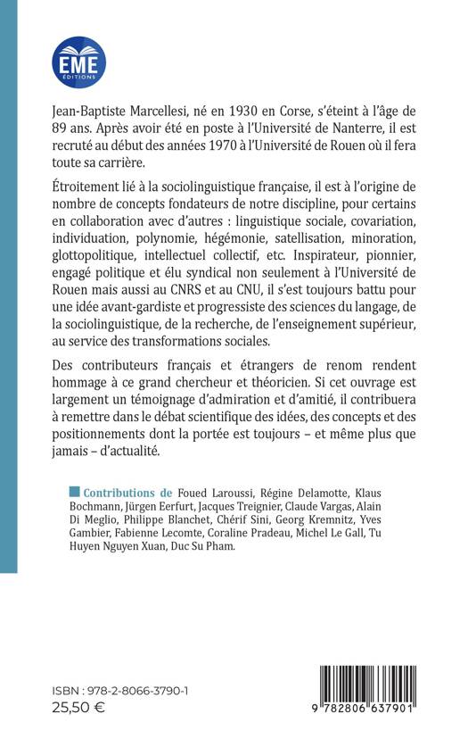 Des contributeurs français et étrangers de renom rendent hommage à Jean-Baptiste Marcellesi, ce grand chercheur et théoricien. Étroitement lié à la sociolinguistique française, il est à l'origine de nombre de concepts fondateurs de notre discipline, pour certains en collaboration avec d'autres: linguistique sociale, covariation, individuation, polynomie, hégémonie, satellisation, minoration, glottopolitique, intellectuel collectif, etc. Si cet ouvrage est largement un témoignage d'admiration et d'amitié, il contribuera à remettre dans le débat scientifique des idées, des concepts et des positionnements dont la portée est toujours - et même plus que jamais - d'actualité.