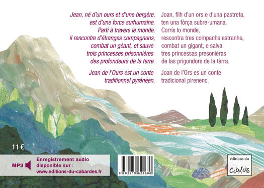 Ce conte traditionnel pyrénéen raconte les aventures de Jean né d’un ours et d’une bergère. D’une force surhumaine Jean part dans le vaste monde où il devra combattre un géant, s’échapper d’un puits, et sauver trois princesses retenues prisonnières dans les profondeurs de la terre. L'histoire enregistrée par l'auteur, qui est aussi conteur, est disponible grâce à un lien donné en 4 ème de couverture du livre. Ce livre est bilingue : Français - Occitan. Les enregistrements audio sont aussi en français et en occitan.