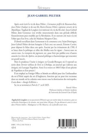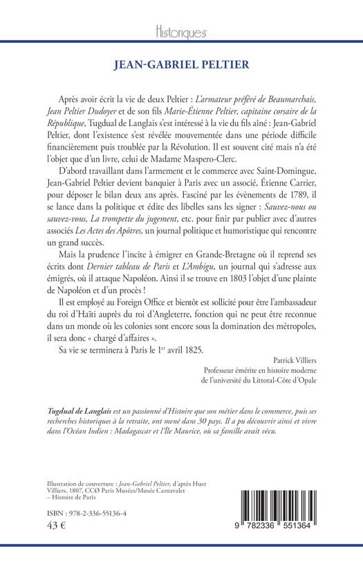 Marie-Étienne Peltier, capitaine corsaire de la République, Tugdual de Langlais s'est intéressé à la vie du fils aîné Jean-Gabriel Peltier, dont l'existence s'est révélée mouvementée dans une période difficile financièrement puis troublée par la Révolution. Il est souvent cité mais n'a été l'objet que d'un livre, celui de Madame Maspero-Clerc.
