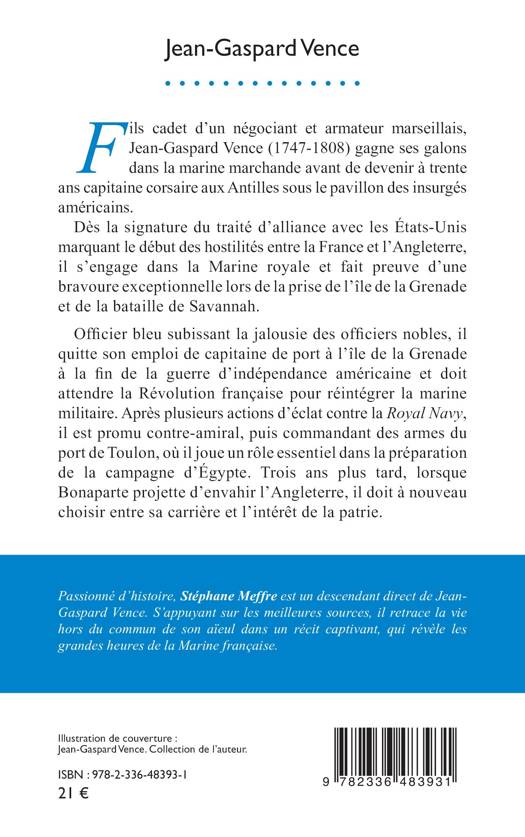 Fils cadet d'un négociant et armateur marseillais, Jean-Gaspard Vence (1747-1808) gagne ses galons dans la marine marchande avant de devenir à trente ans capitaine corsaire aux Antilles sous le pavillon des insurgés américains. Dès la signature du traité d'alliance avec les États-Unis marquant le début des hostilités entre la France et l'Angleterre, il s'engage dans la Marine royale et fait preuve d'une bravoure exceptionnelle lors de la prise de l'île de la Grenade et de la bataille de Savannah. Officier bleu subissant la jalousie des officiers nobles, il quitte son emploi de capitaine de port à l'île de la Grenade à la fin de la guerre d'indépendance américaine et doit attendre la Révolution française pour réintégrer la marine militaire. Après plusieurs actions d'éclat contre la Royal Navy, il est promu contre-amiral, puis commandant des armes du port de Toulon, où il joue un rôle essentiel dans la préparation de la campagne d'Égypte. Trois ans plus tard, lorsque Bonaparte projette d'envahir l'Angleterre, il doit à nouveau choisir entre sa carrière et l'intérêt de la patrie.