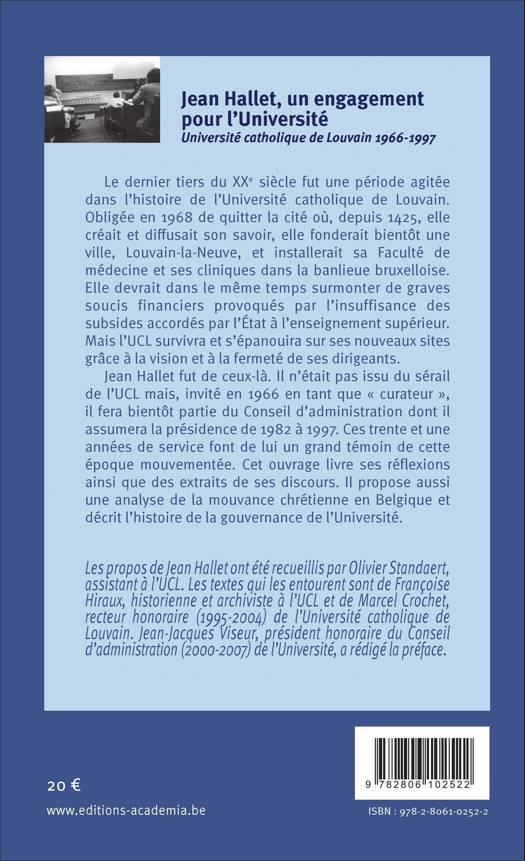 Les souvenirs de Jean Hallet, membre puis président du Conseil d'administration de l'Université catholique de Louvain (1966-1997), éclairent le transfert de l'UCL en Wallonie et à Bruxelles, l'édification de Louvain-la-Neuve, l'implantation de la Faculté de médecine et des cliniques universitaires à Woluwe et la création de l'actuel CHU de Mont-Godinne. Ils mettent en perspective des questions telles que le financement des universités et le contingentement du nombre d'étudiants en médecine.