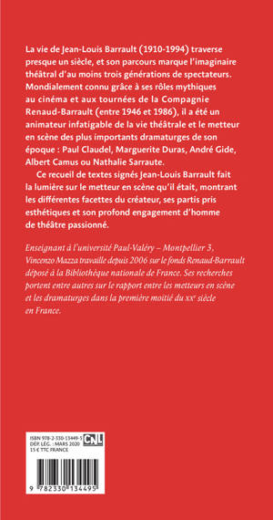 La vie de Jean-Louis Barrault (1910-1994) traverse presque un siècle, et son parcours marque l'imaginaire théâtral d'au moins trois générations de spectateurs. Mondialement connu grâce à ses rôles mythiques au cinéma et aux tournées de la Compagnie Renaud-Barrault (entre 1946 et 1986), il a été un animateur infatigable de la vie théâtrale et le metteur en scène des plus importants dramaturges de son époque : Paul Claudel, Marguerite Duras, André Gide, Albert Camus ou Nathalie Sarraute.