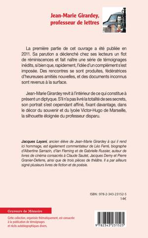 La première partie de cet ouvrage a été publiée en 2011. Sa parution a déclenché chez ses lecteurs un flot de réminiscences et fait naître une série de témoignages inédits, si bien que, rapidement, l'idée d'un complément s'est imposée. Des rencontres se sont produites, fédératrices d'heureuses amitiés nouvelles, et des documents inconnus sont revenus à la surface.Jean-Marie Girardey revit à l'intérieur de ce qui constitue à présent un diptyque. S'il n'a pas livré la totalité de ses secrets, son portrait s'est cependant affiné, fixant davantage, dans le décor du souvenir et du lycée Victor-Hugo de Marseille, la silhouette éloignée du professeur disparu