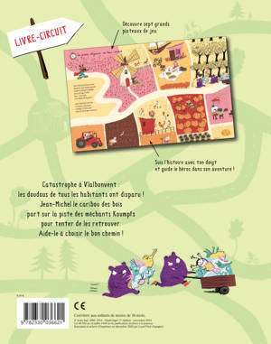 Jean-Michel le caribou des bois Catastrophe à Vlalbonvent : un matin, les doudous de tous les habitants ont disparu ! Jean-Michel, le super caribou des bois, part sur la piste des méchants Koumpfs pour tenter de les retrouver. Sept doubles pages et autant d'ambiances différentes pour jouer à trouver le bon chemin et guider Jean-Michel dans son aventure. Sept étapes, qui sont aussi des moments-clés de la journée des tout-petits, du lever au coucher.