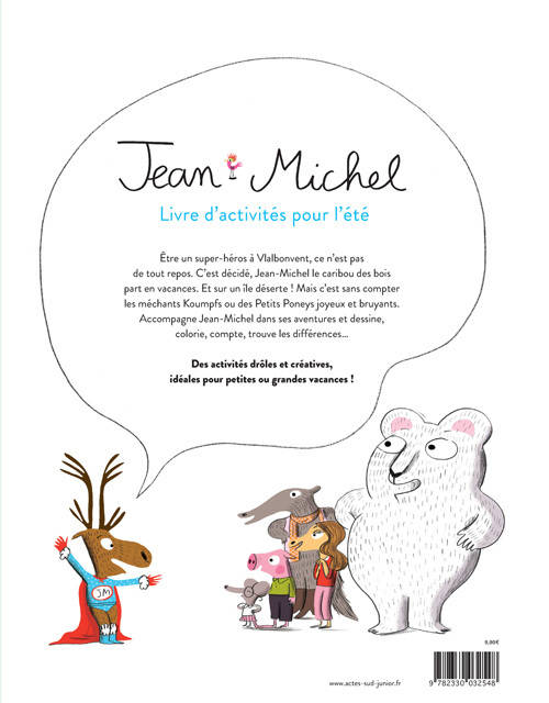 Jean-Michel le caribou, un super-héros en vacances Accomplir des exploits ça fatigue, Jean-Michel a besoin de vacances ! Il fait sa valise et s'envole vers la Poponie, l'île des poneys. Mais, même en vacances, un super-héros ne chôme jamais... De péripéties en sauvetages in extremis, l'enfant dessine, colorie, imagine, observe, trouve les sept différences, joue avec les formes et les couleurs, et surtout s'amuse en compagnie de Jean-Michel et des méchants Koumpfs!