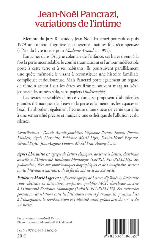 Membre du jury Renaudot, Jean-Noël Pancrazi poursuit depuis 1979 une oeuvre singulière et cohérente, maintes fois récompensée ( Prix du livre inter pour Madame Arnoul en 1995). Enracinés dans l'Algérie coloniale de l'enfance, ses livres disent à la fois la perte inconsolable, le conflit traumatisant et l'amour indéfectible porté à cette terre et à ses habitants. Ils poursuivent parallèlement une quête mémorielle visant à reconstituer une histoire familiale compliquée et douloureuse. Mais Pancrazi porte également un regard de témoin attentif sur les êtres souffrants, souvent marginalisés: jeunesse des années sida, sans-papiers (Indétectable). Les textes rassemblés dans ce volume se proposent d'aborder les grandes thématiques de l'oeuvre: la perte et la mémoire, les espaces et l'exil. Ils abordent également l'écriture d'une quête de vérité qui allie à une sensorialité précise et musicale une esthétique de l'allusion et du silence.