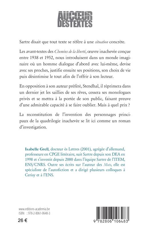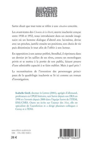 Les avant-textes des Chemins de la liberté, oeuvre inachevée conçue entre 1938 et 1952, nous introduisent dans un monde imaginaire où un homme dialogue d'abord avec lui-même, devise avec ses proches, justifie ensuite ses positions, son choix de vie puis désintimise le tout afin de l'offrir à son lecteur. La reconstitution de l'invention des personnages principaux de la quadrilogie inachevée se lit ici comme un roman d'investigation.