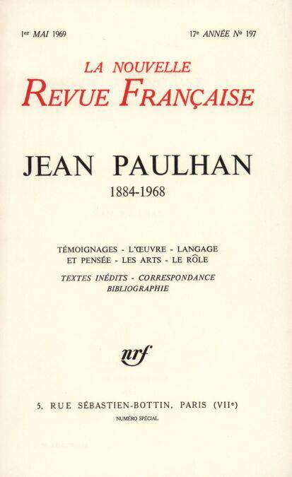 Témoignages : André Pieyre de Mandiargues, Partie gagnée Marcel Jouhandeau, Hommage à Jean Paulhan Henri Michaux, En songeant à l'avenir Roger Judrin, Feuilles mortes Albert Gyergyaï, Souvenirs sur Jean Paulhan Georges Perros, Cent cinq vers Daniel Boulanger, Croquis Roland Purnal, Prose en l'honneur de Jean Paulhan Claude Martine, Un ferme soutien Maurice-Jean Lefebve, Cet homme de confiance Robert Mallet, Jean Paulhan ou La leçon d'insolite Yves Régnier, Les yeux de Jean Édith Boissonnas, Les mots Robert Sébastien, Avec Jean Paulhan Élisabeth Porquerol, Le Nîmois ou L'attraction de l'ennemi Jean Follain, Paulhan l'attentif Jean Paulhan - Valery Larbaud, Entretiens familiers Franz Hellens, Adieu à Jean Paulhan