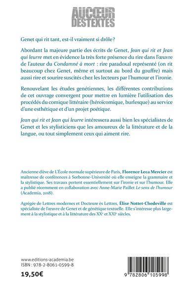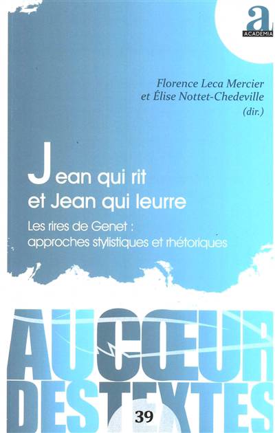Renouvelant les études genétiennes, Jean qui rit et Jean qui leurre analyse le rire dans l’oeuvre de l’auteur du Condamné à mort : rire paradoxal représenté (on rit beaucoup chez Genet, même et surtout au bord du gouffre) mais aussi rire et sourire suscités par l’humour et l’ironie. L’ouvrage étudie l’utilisation abondante des procédés du comique littéraire (héroïcomique, burlesque) au service d’une esthétique et d’un projet poétique.