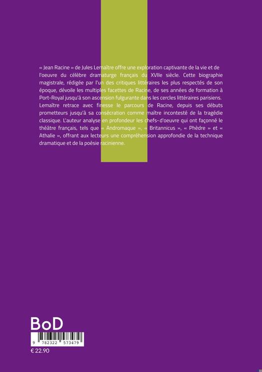 Cette biographie s'inscrit parfaitement dans la catégorie des « Études littéraires » tout en offrant la profondeur d'analyse qu'on attend d'un ouvrage de « Critique dramatique ». Lemaître, lui-même membre de l'Académie française, apporte un éclairage unique sur l'entrée de Racine dans cette institution prestigieuse et sur son rôle d'historiographe du roi.