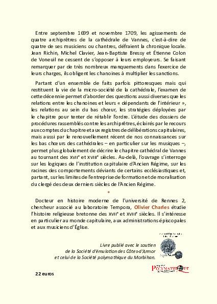 Entre septembre 1699 et novembre 1709, les agissements de quatre archiprêtres de la cathédrale de Vannes, c’est-à-dire de quatre de ses musiciens ou chantres, défraient la chronique locale. Jean Richin, Michel Clavier, Jean-Baptiste Bressy et Étienne Colon de Voneuil ne cessent de s’opposer à leurs employeurs. Se faisant remarquer par de très nombreux manquements dans l’exercice de leurs charges, ils obligent les chanoines à multiplier les sanctions. Partant d’un ensemble de faits parfois pittoresques mais qui restituent la vie de la micro-société de la cathédrale, l’examen de cette décennie permet d’aborder des questions aussi diverses que les relations entre les chanoines et leurs « dépendants de l’intérieur », les relations au sein du bas chœur, les stratégies déployées par le chapitre pour tenter de rétablir l’ordre. L’étude des dossiers de procédures rassemblés contre les archiprêtres, éclairés par le recours aux comptes du chapitre et aux registres de délibérations capitulaires, mais aussi par le renouvellement récent de nos connaissances sur les bas chœurs des cathédrales – en particulier sur les musiques –, permet plus globalement de décrire le chapitre cathédral de Vannes au tournant des xviie et xviiie siècles. Au-delà, l’ouvrage s’interroge sur les logiques de l’institution capitulaire d’Ancien Régime, sur les racines des comportements déviants de certains ecclésiastiques et, partant, sur les limites de l’entreprise de formation et de moralisation du clergé des deux derniers siècles de l’Ancien Régime.