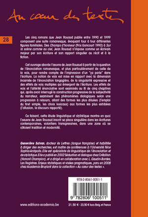 Cet ouvrage est une étude linguistique et stylistique de l'œuvre romanesque familiale de Jean Rouaud, qui comprend cinq titres : "Les Champs d'honneur" (1990), "Des hommes illustres" (1993), "Le Monde à peu près" (1996), "Pour vos cadeaux" (1998), "Sur la Scène comme au ciel" (1999). Il étudie l'œuvre à partir de la question de l'énonciation romanesque et rend compte des phénomènes d'émergence de la voix dans l'écriture.