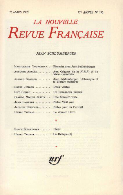 Jean Schlumberger : Marguerite Yourcenar, Ébauche d'un Jean Schlumberger Auguste Anglès, Aux origines de la N.R.F. et du Vieux-Colombier Alfred Grosser, Jean Schlumberger, l'Allemagne et la morale politique Ernst Jünger, Deux visites Guy Rohou, Un romancier mesuré Claude Michel Cluny, Une lumière vraie Jean Lambert, Notre vieil ami Jacques Brenner, Notes pour un portrait Henri Thomas, Le dernier livre Édith Boissonnas, Lieux Henri Thomas, La Relique