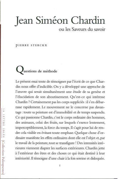Pierre Sterckx poursuit une série d'études consacrées à des artistes majeurs suivant une approche résolument deleuzienne. Il ne s'agit pas seulement ici de mobiliser des « images-concepts » mais surtout d'expérimenter une manière d'écrire avec la peinture plutôt que sur ou à propos d'elle. La Raie est d'une violence spectaculaire et chardin s'en est écarté très vite, lui préférant l'intensité de la couleur et celle du trait, rythmées en la vigueur fractale de la touche. non plus cruauté d'une scène mais forces des sensations. au-delà du supplice de La Raie, il s'est emparé de l'énergie première, celle qui disloque et agence les morceaux du sensible. il évita de la sorte le piège dans lequel s'engouffrera tout le versant expressionniste de l'art moderne, soumission de l'expérimentation du medium aux effets attendus des formes ou des images torturées. sa peinture est voisine de celle de cézanne et de Bonnard car elle mit l'oeil du spectateur au travail, avec un siècle d'avance sur l'impressionnisme. elle concerna l'Encyclopédie de son ami Diderot par les rapports qu'elle instaura entre les jeux des enfants et la science des adultes. Brillat-savarin (gastronomie) et Lavoisier (chimie) sont tout proches de lui. chardin vécut ou pressentit les divers vacillements de son temps (banqueroute de Law, théâtre de Marivaux, révolution de 1789) mais il en aborda les troublantes incertitudes avec la ferveur de ceux qui croient au progrès.