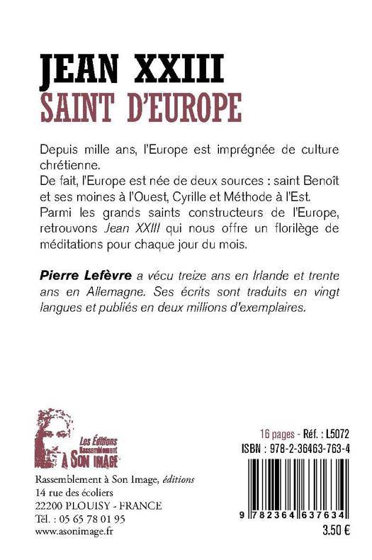 Jean XXIII Saint d'Europe Depuis mille ans, l'Europe est imprégnée de culture chrétienne. De fait, l'Europe est née de deux sources : saint Benoît et ses moines à l'Ouest, Cyrille et Méthode à l'Est. Parmi les grands saints constructeurs de l'Europe, retrouvons Jean XXIII qui nous offre un florilège de méditations pour chaque jour du mois.
