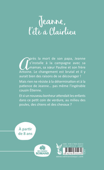 Après la mort de son papa, Jeanne s'installe à la campagne avec sa maman, sa sœur Pauline et son frère Antoine. Le changement est brutal et il y aurait bien des raisons de se décourager ! Mais rien ne résiste à la détermination et à la patience de Jeanne... pas même l'ingérable cousin Étienne. Et si un nouveau bonheur attendait les enfants dans ce petit coin de verdure, au milieu des poules, des chiens et des chevaux ?
