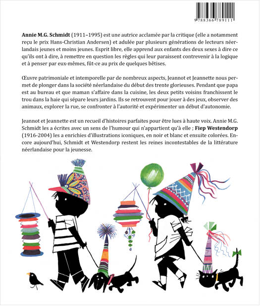 Annie M.G. Schmidt (1911–1995) est une autrice acclamée par la critique (elle a notamment reçu le prix Hans-Christian Andersen) et adulée par plusieurs générations de lecteurs néerlandais jeunes et moins jeunes. Esprit libre, elle apprend aux enfants des deux sexes à dire ce qu’ils ont à dire, à remettre en question les règles qui leur paraissent contrevenir à la logique et à penser par eux-mêmes, fût-ce au prix de quelques bêtises. Œuvre patrimoniale et intemporelle par de nombreux aspects, Jeannot et Jeannette nous permet de plonger dans la société néerlandaise du début des trente glorieuses. Pendant que papa est au bureau et que maman s’affaire dans la cuisine, les deux petits voisins franchissent le trou dans la haie qui sépare leurs jardins. Ils se retrouvent pour jouer à des jeux, observer des animaux, explorer la rue, se confronter à l’autorité et expérimenter un début d’autonomie. Jeannot et Jeannette est un recueil d’histoires parfaites pour être lues à haute voix. Annie M.G. Schmidt les a écrites avec un sens de l’humour qui n’appartient qu’à elle ; Fiep Westendorp (1916-2004) les a enrichies d’illustrations iconiques, en noir et blanc et ensuite colorées. Encore aujourd’hui, Schmidt et Westendorp restent les reines incontestables de la littérature néerlandaise pour la jeunesse.