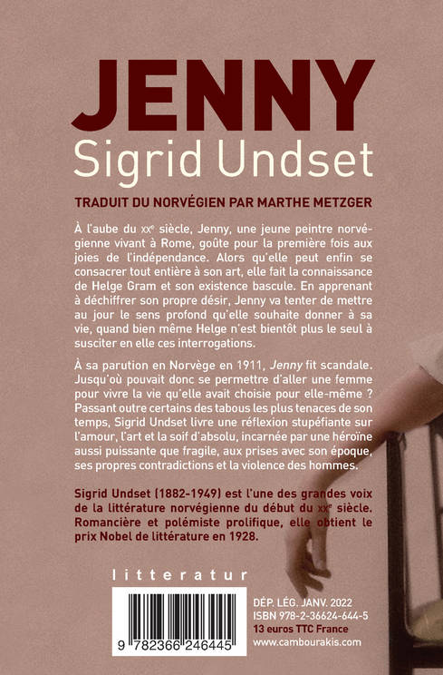 À l'aube du xxe siècle, Jenny, une jeune peintre norvégienne vivant à Rome, goûte pour la première fois aux joies de l'indépendance. Alors qu'elle peut enfin se consacrer tout entière à son art, elle fait la connaissance de Helge Gram et son existence bascule. En apprenant à déchiffrer son propre désir, Jenny va tenter de mettre au jour le sens profond qu'elle souhaite donner à sa vie, quand bien même Helge n'est bientôt plus le seul à susciter en elle ces interrogations. À sa parution en Norvège en 1911, Jenny fit scandale. Jusqu'où pouvait donc se permettre d'aller une femme pour vivre la vie qu'elle avait choisie pour elle-même ? Passant outre certains des tabous les plus tenaces de son temps, Sigrid Undset livre une réflexion stupéfiante sur l'amour, l'art et la soif d'absolu, incarnée par une héroïne aussi puissante que fragile, aux prises avec son époque, ses propres contradictions et la violence des hommes.