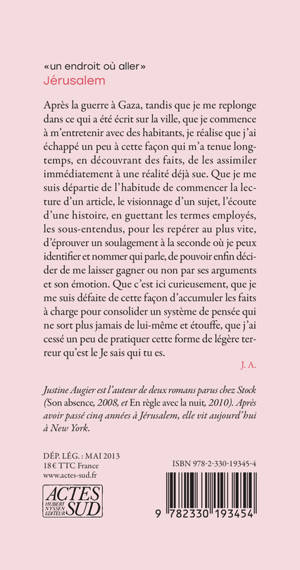 En faisant miroiter les histoires qui constituent la population de La Ville, Justine Augier trace un portrait singulier et pluriel de Jérusalem, faisant affleurer ses complexités d'une manière aussi limpide que sensible. Composé de fragments de récits et de littérature comme autant de polaroïds en temps réel, «Jérusalem» est un texte inquiet et pénétrant qui place le lecteur face à sa plus urgente et sa plus déterminante responsabilité : celle d'écouter avant de juger. Nécessaire.
