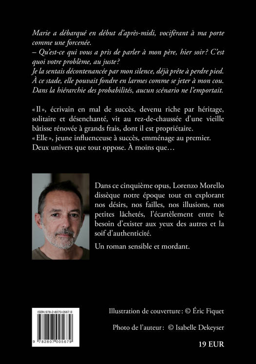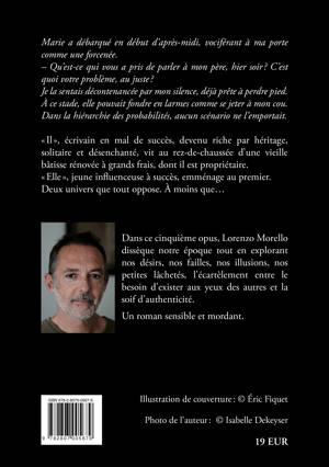 «âIlâ», écrivain en mal de succès, devenu riche par héritage, incapable d'assumer sur la durée une liaison sentimentale, dès lors solitaire et désenchanté, vit de ses rentes au rez-de-chaussée d’une vieille bâtisse rénovée à grands frais, dont il est propriétaire. «âElleâ», jeune influenceuse à succès, emménage au premier. Deux univers que tout oppose. Quoique... Une relation ambiguë s'engage entre les deux. Sans oublier l'ex-maîtresse du père, qui conserve la maison et paie l'héritier en nature. Dans ce cinquième opus, Lorenzo Morello dissèque notre époque tout en explorant nos désirs, nos failles, nos illusions, nos petites lâchetés, l’écartèlement entre le besoin d’exister aux yeux des autres et la soif d’authenticité. Un roman sensible et mordant. Lorenzo Morello, technicien en mécanique des sols, est né à Bruxelles en 1971. Il a déjà publié quatre romans, dont, aux éditions M.E.O., "Pierre, papier, ciseaux" et "Voulez-vous", dans lesquels il décapait déjà au vitriol les aberrations et les illusions de notre monde.
