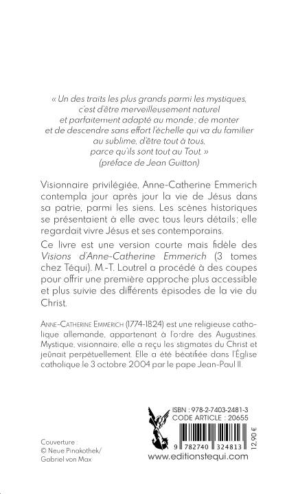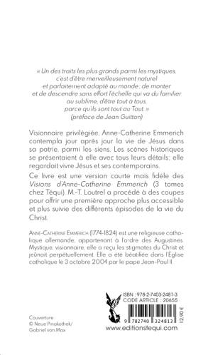 « Un des traits les plus grands parmi les mystiques, comme Thérèse d’Avila, c’est en effet d’être merveilleusement naturel et parfaitement adapté au monde , de monter et de descendre sans effort l’échelle qui va du familier au sublime, d’éprouver, de traduire toutes les variétés du sentiment depuis l’enjouement jusqu’à une divine mélancolie, en somme, d’être tout à tous, parce qu’ils sont tout au Tout » (Jean Guitton). Visionnaire privilégiée, celle-ci contempla jour après jour la vie de Jésus dans sa patrie, parmi les siens. Les scènes historiques se présentaient à elle avec tous leurs détails , elle regardait vivre Jésus et ses contemporains, les écoutait parler on l’entendait parfois répéter en araméen les expressions du temps. Un ouvrage pour découvrir le Christ au quotidien.
