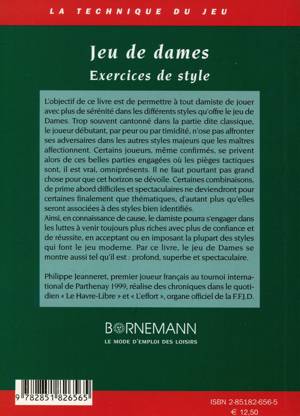 L'objectif de ce livre est de permettre à tout damiste de jouer avec plus de sérénité dans les différents styles qu'offre le jeu de Dames. Trop souvent cantonné dans la partie dite classique, le joueur débutant, par peur ou par timidité, n'ose pas affronter ses adversaires dans les autres styles majeurs que les maîtres affectionnent. Certains joueurs, même confirmés, se privent alors de ces belles parties engagées où les pièges tactiques sont, il est vrai, omniprésents. Il ne faut pourtant pas grand-chose pour que cet horizon se dévoile. Certaines combinaisons, de prime abord difficiles et spectaculaires ne deviendront pour certaines finalement que thématiques, d'autant plus qu'elles seront associées à des styles bien identifiés. Ainsi, en connaissance de cause, le damiste pourra s'engager dans les luttes à venir toujours plus riches avec plus de confiance et de réussite, en acceptant ou en imposant la plupart des styles qui font le jeu moderne. Par ce livre, le jeu de Dames se montre aussi tel qu'il est : profond, superbe et spectaculaire.