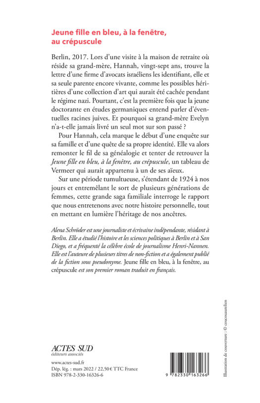 Berlin, 2017. Lors d'une visite à la maison de retraite où réside sa grand-mère, Hannah, vingt-sept ans, trouve la lettre d'une firme d'avocats israéliens les identifiant, elle et sa seule parente encore vivante, comme les possibles héritières d'une collection d'art qui aurait été cachée pendant le régime nazi. Pourtant, c'est la première fois que la jeune doctorante en études germaniques entend parler d'éventuelles racines juives. Et pourquoi sa grand-mère Evelyn n'a-t-elle jamais livré un seul mot sur son passé ? Pour Hannah, cela marque le début d'une enquête sur sa famille et d'une quête de sa propre identité. Elle va alors remonter le fil de sa généalogie et tenter de retrouver la Jeune fille en bleu, à la fenêtre, au crépuscule, un tableau de Vermeer qui aurait appartenu à un de ses aïeux. Sur une période tumultueuse, s'étendant de 1924 à nos jours et entremêlant le sort de plusieurs générations de femmes, cette grande saga familiale interroge le rapport que nous entretenons avec notre histoire personnelle, tout en mettant en lumière l'héritage de nos ancêtres.