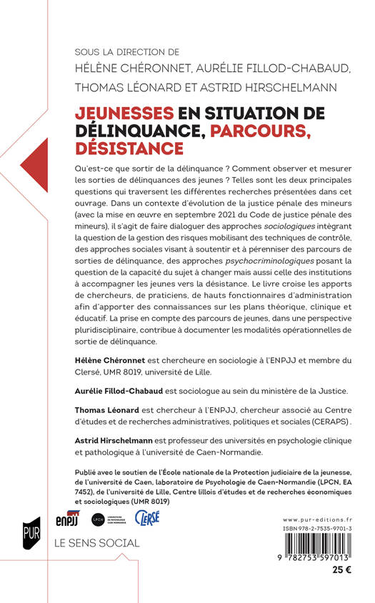 Qu’est-ce que sortir de la délinquance ? Comment observer et mesurer les sorties de délinquances des jeunes ? Telles sont les deux principales questions qui traversent les différentes recherches présentées dans cet ouvrage. Dans un contexte d’évolution de la justice pénale des mineurs (avec la mise en oeuvre en septembre 2021 du Code de justice pénale des mineurs), il s’agit de faire dialoguer des approches sociologiques intègrant la question de la gestion des risques mobilisant des techniques de contrôle, des approches sociales visant à soutentir et à pérenniser des parcours de sorties de délinquance, des approches psychocriminologiques posant la question de la capacité du sujet à changer mais aussi celle des institutions à accompagner les jeunes vers la désistance. Le livre croise les apports de chercheurs, de praticiens, de hauts fonctionnaires d’administration afin d’apporter des connaissances sur les plans théorique, clinique et éducatif. La prise en compte des parcours de jeunes, dans une perspective pluridisciplinaire, contribue à documenter les modalités opérationnelles de sortie de délinquance.
