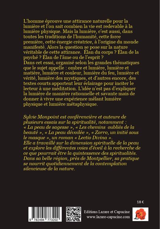L’homme éprouve une attirance naturelle pour la lumière et l’on sait combien la vie est redevable à la lumière physique. Mais la lumière, c’est aussi, dans toutes les traditions de l’humanité, cette force première, cette énergie créatrice, à l’origine du monde manifesté. Alors la question se pose sur la nature véritable de cette attirance. Élan du corps ? Élan de la psyché ? Élan de l’âme ou de l’esprit ? Dans cet essai, organisé selon les grandes thématiques que le sujet appelle : ombre et lumière, lumière et matière, lumière et couleur, lumière du feu, lumière et vérité, lumière des mystiques, et d’autres encore, des textes courts apportent leur éclairage pour inciter le lecteur à une méditation. L’idée n’est pas d’expliquer la lumière de manière rationnelle et savante mais de donner à vivre une expérience mêlant lumière physique et lumière métaphysique. Sylvie Monpoint est conférencière et auteure de plusieurs essais sur la spiritualité, notamment : « La peau de sagesse », « Les chemins oubliés de la beauté », « La peau dévoilée », « Zorro, un initié sous le masque », un roman « Lectio Divina ». Elle a travaillé sur la dimension spirituelle de la peau et explore les différentes voies d’éveil à la recherche de ce que pourrait être la quintessence des spiritualités. Dans sa belle région, près de Montpellier, sa pratique se nourrit quotidiennement de la contemplation silencieuse de la nature.