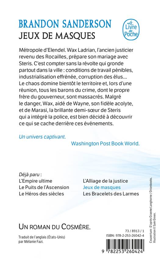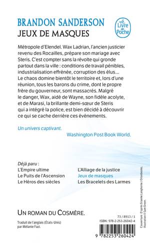 Avec cinq millions d’exemplaires vendus, des traductions dans plus de trente pays, des romans récompensés par de nombreux prix et une presse dithyrambique, Brandon Sanderson est depuis plus de dix ans l’un des grands maîtres de l’Imaginaire. Dans Jeux de masques, il propose une nouvelle histoire spectaculaire, pleine des rebondissements dont il a le secret.
