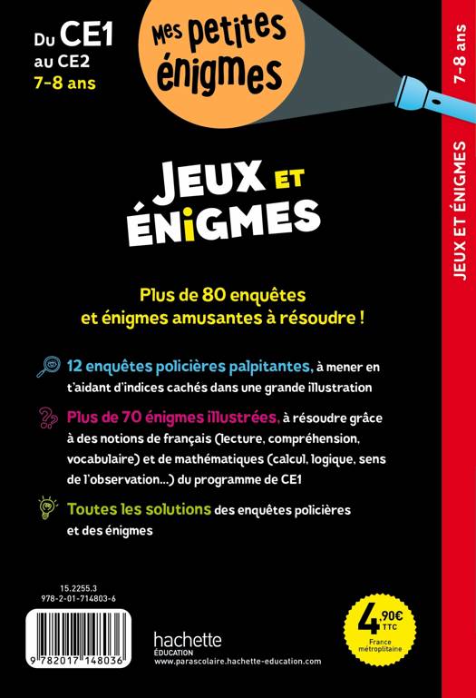 Plus de 70 énigmes illustrées s’appuyant sur des savoir-faire de français (lecture, compréhension, vocabulaire) et de mathématiques (calcul, raisonnement logique, résolution de petits problèmes, sens de l’observation…).
