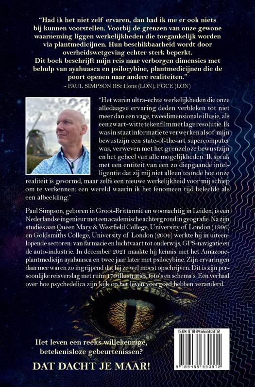 Paul Simpson, geboren in Groot-Brittannië en woonachtig in Leiden, is een Nederlandse ingenieur met een academische achtergrond in geografie. Na zijn studies aan Queen Mary & Westfield College, University of London (1996) en Goldsmiths College, University of London (2004) werkte hij in uiteenlopende sectoren: van farmacie en luchtvaart tot onderwijs, GPS-navigatie en de auto-industrie. In december 2021 maakte hij kennis met het Amazone-plantmedicijn ayahuasca en twee jaar later met psilocybine. Zijn ervaringen daarmee waren zo ingrijpend dat hij ze wel moest opschrijven. Dit is zijn persoonlijke reisverslag met ruim 170 illustraties, foto’s en schema’s. Een verhaal over hoe psychedelica zijn kijk op het leven voorgoed hebben veranderd.
