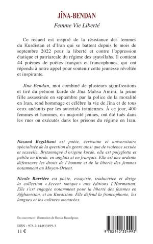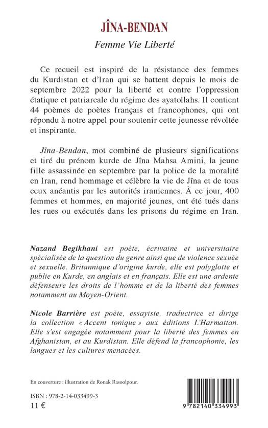 Ce recueil est inspiré de la résistance des femmes du Kurdistan et d'Iran qui se battent depuis le mois de septembre 2022 pour la liberté et contre l'oppression étatique et patriarcale du régime des ayatollahs. Il contient 44 poèmes de poètes français et francophones, qui ont répondu à notre appel pour soutenir cette jeunesse révoltée et inspirante. Jîna-Bendan, mot combiné de plusieurs significations et tiré du prénom kurde de Jîna Mahsa Amini, la jeune fille assassinée en septembre par la police de la moralité en Iran, rend hommage et célèbre la vie de Jîna et de tous ceux anéantis par les autorités iraniennes. À ce jour, 400 femmes et hommes, en majorité jeunes, ont été tués dans les rues ou exécutés dans les prisons du régime en Iran.