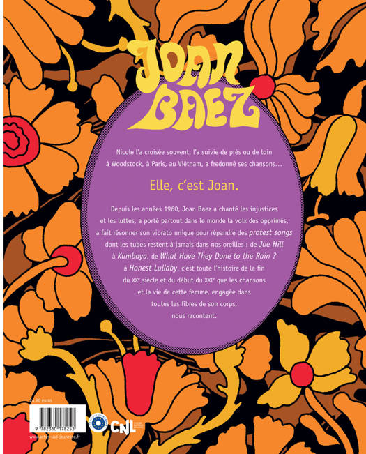Nicole l'a croisée souvent, l'a suivie de près ou de loin à Woodstock, à Paris, au Viêtnam, a fredonné ses chansons... Elle, c'est Joan. Depuis les années 1960, Joan Baez a chanté les injustices et les luttes, a porté partout dans le monde la voix des opprimés, a fait résonner son vibrato unique pour répandre des "protest songs" dont les tubes restent à jamais dans nos oreilles : de "Joe Hill" à "Kumbaya", de "What Have They Done to the Rain ?" à "Honest Lullaby", c'est toute l'histoire de la fin du XXe siècle et du début du XXIe que les chansons et la vie de cette femme, engagée dans toutes les fibres de son corps, nous racontent.