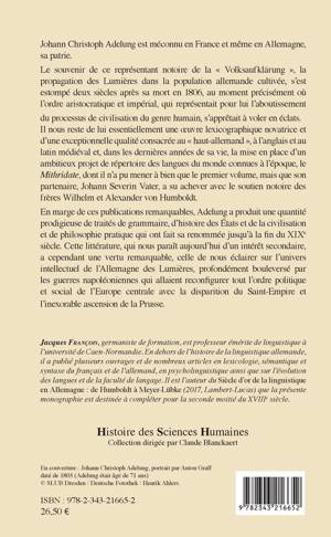 Johann Christoph Adelung est méconnu en France et même en Allemagne, sa patrie. Le souvenir de ce représentant notoire de la « Volksaufklärung » s'est estompé deux siècles après sa mort en 1806. Il nous reste de lui essentiellement une oeuvre lexicographique novatrice et d'une exceptionnelle qualité consacrée au « haut-allemand », à l'anglais et au latin médiéval et, dans les dernières années de sa vie, la mise en place d'un ambitieux projet de répertoire des langues du monde connues à l'époque, le Mithridate. En marge de ces publications remarquables, Adelung a produit une quantité prodigieuse de traités de grammaire, d'histoire des États et de la civilisation et de philosophie pratique. Cette littérature, qui nous paraît aujourd'hui d'un intérêt secondaire, a cependant une vertu remarquable, celle de nous éclairer sur l'univers intellectuel de l'Allemagne des Lumières, profondément bouleversé par les guerres napoléoniennes qui allaient reconfigurer tout l'ordre politique et social de l'Europe centrale avec la disparition du Saint-Empire et l'inexorable ascension de la Prusse.