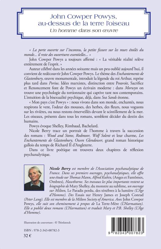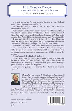 Ecrivain britannique (anglo-gallois) célébré dans les années soixante mais un peu oublié aujourd'hui, il convient de redécouvrir John Cowper Powys. Idées marxistes, distinction entre Pouvoir, Sacrifice et Renoncement font de Powys un écrivain moderne. Nicole Berry trace un portrait de l'homme à travers la succession de ses romans : Wood and Stone, Rodmoore, Wolf Solent, Les enchantements de Glastonbury... Dans ce livre poétique, on trouvera deux chapitres de réflexion psychanalytique.
