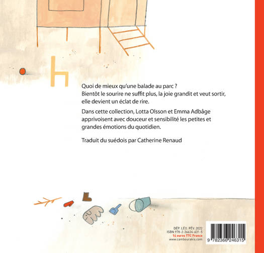 Quoi de mieux qu'une balade au parc ? Bientôt le sourire ne suffit plus, la joie grandit et veut sortir, elle devient un éclat de rire. Dans cette collection, Lotta Olsson et Emma Adbåge apprivoisent avec douceur et sensibilité les petites et grandes émotions du quotidien.