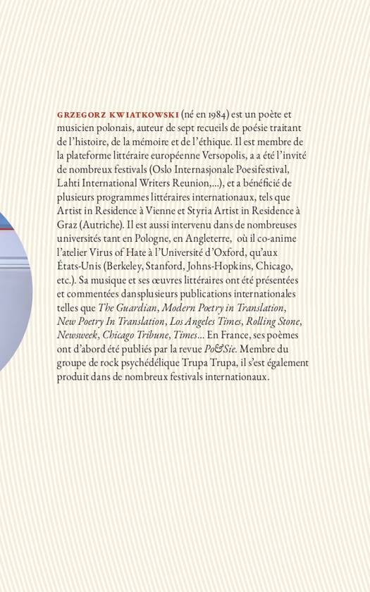 Ce livre réunit quatre des sept recueils du poète polonais Grzegorz Kwiatkowski (né en 1984), Joies, (2013), Combustion (2015), Par un hibou (2017) et Karl-Heinz M. (2019) dans la traduction de Zbigniew Naliwajek. Ces poèmes, placés à l’intersection de l’inspiration de Spoon river Anthology d’Edgar Lee Masters mais aussi de Shoah de Claude Lanzmann, frappent par leur force crue, voire cruelle. « Des vies brèves? Se disant telles—pour mieux se ficher, en éclats acérés, dans nos mémoires », selon les mots de Claude Mouchard. Une grande voix de la jeune poésie polonaise qui nous met en demeure de revivre et de repenser l’indicible, l’immédiateté semblant à présent le plus sûr chemin de l’anamnèse. Extrait de la préface de Claude Mouchard Joies ? Ce titre (celui du premier groupe de poèmes ici rassemblés), on n’évitera pas — lisant-relisant le mince (mais combien intense) recueil qu’il ouvre — de l’entendre sonner cruellement. Des « joies » ! C’est un sarcasme qui est lancé au lecteur. Celui-ci n’aura-t-il pas à éprouver que, si tous ces poèmes vibrent si brièvement, ce ne sera jamais que pour se rééchapper, l’un après l’autre, immanquablement, en autant d’énigmes ensanglantées ? Joies... : ce titre est aussi celui du premier poème, et le mot va revenir dans le dernier vers de ce même poème. De ce poème initial, la simplicité nous saisit : il flotte sur la vision atroce que, d’abord, son épigraphe nous aura imposée — ou intimée comme un ordre : le sang coule là-bas comme l’eau dans la rivière sauve-toi ! Se sauver ? Le lecteur, lui, aura été, d’emblée, saisi, et ne saurait fuir. Lisant plus avant, il reviendra à cette épigraphe, à l’aveuglante fluidité qui y menace — en arrière-plan de ce poème, voire de tous les autres. Ces poèmes si brefs, on ne pourra que les lire et, peut-être, les quasi oublier, mais pour d’autant mieux les relire — selon la puissance discrète de leurs émergences et re-submersions. Des résurgences de moments historiques terribles font leur tension, leurs rythmes, et l’effectivité de leurs liens à ce qui a eu lieu, collectivement, de plus abject, de plus insoutenable.