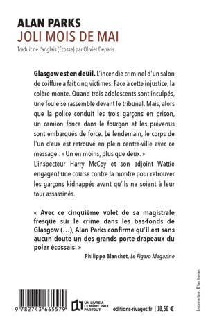 Dans ce cinquième volet, l'inspecteur Harry McCoy engage une course contre la-montre pour retrouver des jeunes délinquants mystérieusement kidnappés, dans une Glasgow plus noire que jamais. Une série désormais incontournable qui a gagné un lectorat de plus en plus nombreux. Parks continue d'explorer la ville de Glasgow au début des années 70 mais il se renouvelle à chaque fois. Un sens des dialogues et du rythme toujours aussi aiguisé. Un talent de conteur qui rend la lecture addictive.