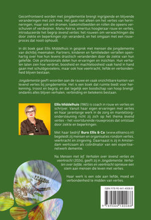 In dit boek gaat Ellis Middelhuis in gesprek met mensen die jongdementie van dichtbij meemaken. Partners, kinderen en familieleden vertellen openhartig over hoe hun levens drastisch veranderden door de ziekte van hun geliefde. Ook professionals delen hun ervaringen en inzichten. Hun verhalen laten zien hoe verdriet, boosheid en machteloosheid vaak hand in hand gaan met schuldgevoelens, maar ook hoe veerkracht, liefde en verbondenheid blijven bestaan. Jongdementie geeft woorden aan de rauwe en vaak onzichtbare kanten van levend verlies bij jongdementie. Het is een boek dat ruimte biedt voor herkenning, troost en begrip, en dat tegelijk een boodschap van hoop brengt: ondanks alles blijven verhalen, verbinding en betekenis bestaan. Ellis Middelhuis (1965) is coach in rouw en verlies en schrijver. Vanuit haar eigen ervaringen met verlies en haar jarenlange werk in de zorg en mantelzorgondersteuning richt zij zich op het thema levend verlies – het voortdurende rouwproces dat ontstaat door ziekte en beperkingen.