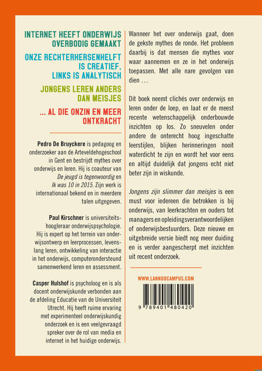 INTERNET HEEFT ONDERWIJS OVERBODIG GEMAAKT ONZE RECHTERHERSENHELFT IS CREATIEF, LINKS IS ANALYTISCH JONGENS LEREN ANDERS DAN MEISJES ... AL DIE ONZIN EN MEER ONTKRACHT Wanneer het over onderwijs gaat, doen de gekste mythes de ronde. Het probleem daarbij is dat mensen die mythes voor waar aannemen en ze in het onderwijs toepassen. Met alle nare gevolgen van dien ... Dit boek neemt clichés over onderwijs en leren onder de loep, en laat er de meest recente wetenschappelijk onderbouwde inzichten op los. Zo sneuvelen onder andere de onterecht hoog ingeschatte leerstijlen, blijken herinneringen nooit waterdicht te zijn en wordt het voor eens en altijd duidelijk dat jongens echt niet beter zijn in wiskunde. Jongens zijn slimmer dan meisjes is een must voor iedereen die betrokken is bij onderwijs, van leerkrachten en ouders tot managers en opleidingsverantwoordelijken of onderwijsbestuurders. Deze nieuwe en uitgebreide versie biedt nog meer duiding en is verder aangescherpt met inzichten uit recent onderzoek.